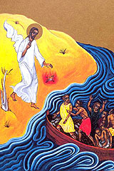 Algum tempo depois, Jesus apareceu outra vez aos discípulos, junto ao lago do Tiberíades, e manifestou-se deste modo: Estavam juntos Simão Pedro, Tomé, a quem chamavam o Gémeo, Natanael, de Caná da Galileia, os filhos de Zebedeu e outros dois discípulos. Disse-lhes Simão Pedro: «Vou pescar.» Eles responderam-lhe: «Nós também vamos contigo.» Saíram e subiram para o barco, mas naquela noite não apanharam nada. Ao romper do dia, Jesus apresentou-se na margem, mas os discípulos não sabiam que era Ele. Jesus disse-lhes, então: «Rapazes, tendes alguma coisa para comer?» Eles responderam-lhe: «Não.» Disse-lhes Ele: «Lançai a rede para o lado direito do barco e haveis de encontrar.» Lançaram-na e, devido à grande quantidade de peixes, já não tinham forças para a arrastar. Então, o discípulo que Jesus amava disse a Pedro: «É o Senhor!» Simão Pedro, ao ouvir que era o Senhor, apertou o saio, porque estava sem mais roupa, e lanlou-se à água. Os outros discípulos vieram no barco, puxando a rede com os peixes; com efeito, não estavam longe da terra, mas apenas a uns noventa metros. Ao saltarem para terra, viram umas brasas preparadas com peixe em cima e pão. Jesus disse-lhes: «Trazei dos peixes que apanhastes agora.» Simão Pedro subiu à barca e puxou a rede para terra, cheia de peixes grandes: cento e cinquenta e três. E, apesar de serem tantos, a rede não se rompeu. Disse-lhes Jesus: «Vinde almoçar.» E nenhum dos discípulos se atrevia a perguntar-lhe: «Quem és Tu?», porque bem sabiam que era o Senhor. Jesus aproximou-se, tomou o pão e deu-lho, fazendo o mesmo com o peixe. (Jo 21, 1-13)