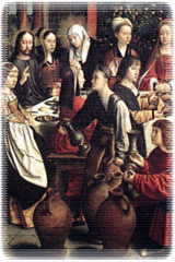 Celebrava-se um casamento em Caná. Estava ali a Mãe de Jesus. Este também foi convidado com os Seus discípulos. Acaba-se o vinho. Sua mãe diz a Jesus: «Não têm vinho.» Jesus retorquiu: «Que temos nós com isso, mulher? A Minha hora ainda não chegou.» Sua mãe indica-O aos servidores: «Fazei o que Ele vos disser.» Jesus disse-lhes: «Enchei de água essas talhas. E levai ao chefe de mesa.» Quando este provou o líquido, disse: «Toda a gente serve primeiro o vinho bom; tu, porém, guardaste o vinho bom até agora.» Foi o primeiro sinal de Jesus. Assim manifestou a Sua glória, e os Seus discípulos acreditaram n'Ele.